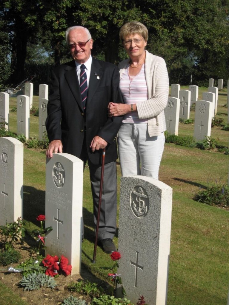 Val and Stan standing beside the graves of the men of HMS Fratton and the grave adopted by Val in Ryes Cemetery, 2010