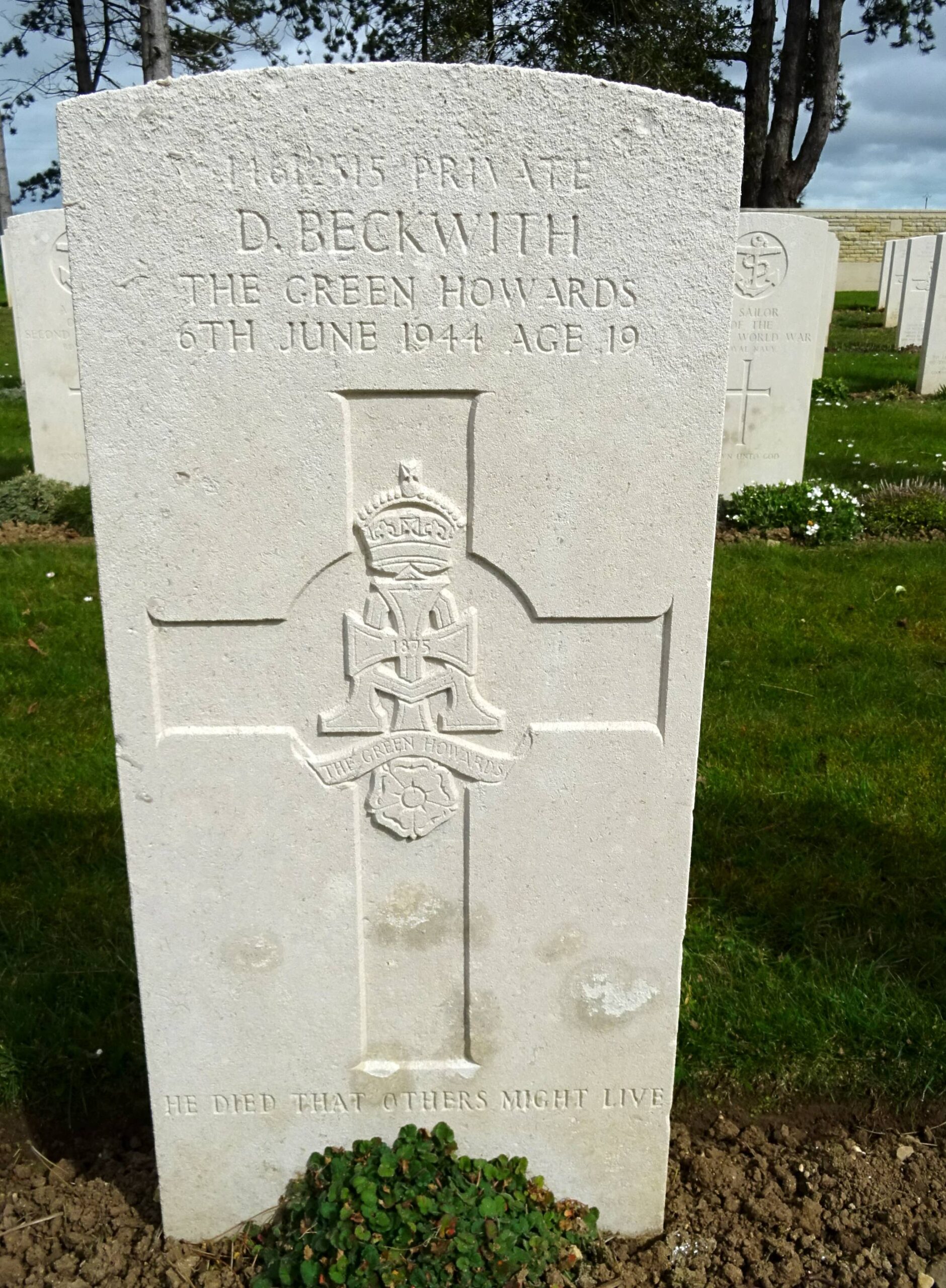 I do not know when Derrick Beckwith was to enlist or was conscripted but he was to find himself fighting on D-Day and laid down his life for our freedom. He was serving with 6th Battalion, Green Howards who landed on Gold Beach on D-Day. After landing, they attacked strong points and the gun positions in Mont Fleury. They completed their first objective by midday and moved through Ver-sur-Mer towards Crépon. But they encountered German resistance as they approached Crépon. D Company was tasked with clearing the Germans from the village whilst the other platoons by-passed it.