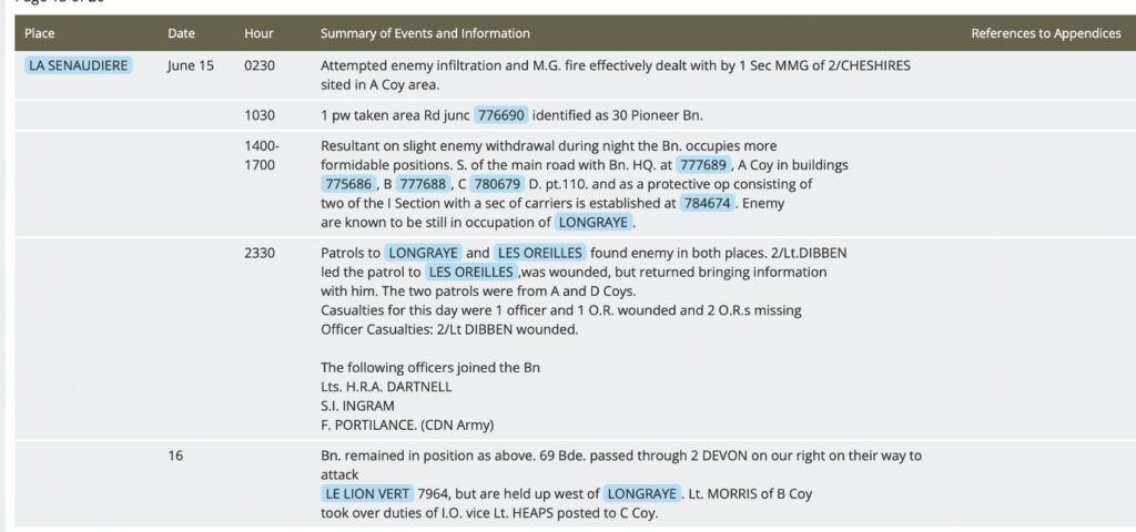 At 11:30pm, two night patrols were sent out, one was sent towards Longraye and the other towards Les Oreilles. These missions were carried out in the dark to try and gather information. The mission at Les Oreilles was led by 2nd Lieutenant Dibben, who was wounded but successfully returned with vital information. However, not everyone came back.