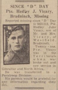 Remembering Hedley John Vicary. Whilst doing some research about a family member on Find My Past I came across this article about John Hedley Vicary from Bradninch. Hedley is not a family member but I looked at his entry and found there was not a photo attached. I appreciate it is a grainy newspaper cutting, but you might like to add it to the Roll of Honour.