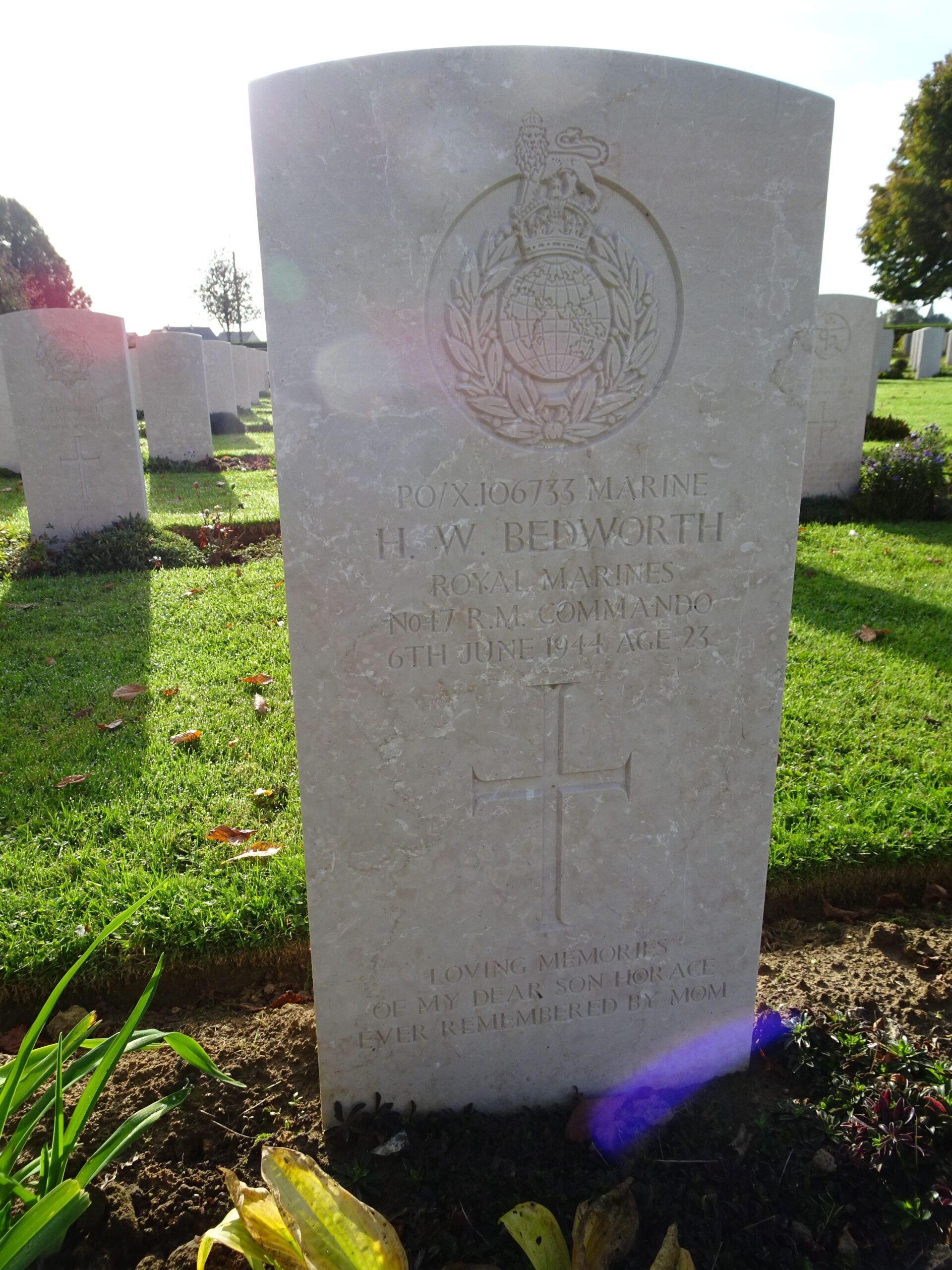 Horace Bedworth was recorded as having been killed in action and he was initially buried in Ver-sur-Mer. He was reburied on the 30th of November 1944 at Bayeux British Cemetery, where he now lies.