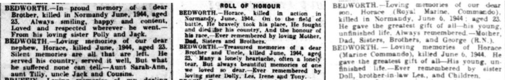 Sadly, I have no information on Horace Bedworth, neither his early or teen years and I do not know when he was to enlist or was conscripted but he was to find himself fighting on D-Day and laid down his life for our freedom.
