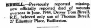 At first Tom Birrell was reported missing on D-Day and his Royal Engineers Casualty Card tells us that he was reported missing believed wounded. A notification to that effect was sent to his family on the 26th June but on the 2nd August they were notified that he had died of wounds at some point between the 6th and 7th June. Shortly after, his father placed a notice in the Coatbridge Leader on the 12th August.