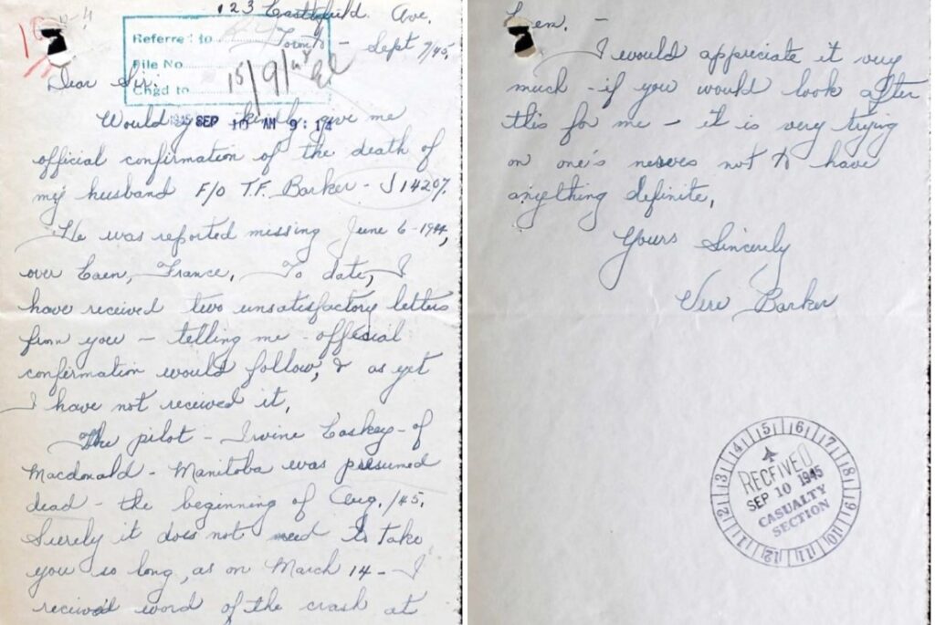 Vere wrote: Would you kindly give me official confirmation of the death of my husband F/O T. F. Barker - J14207. He was reported missing June 6 1944, over Caen, France. To date, I have received two unsatisfactory letters from you telling me official confirmation would follow & as yet I have not received it.